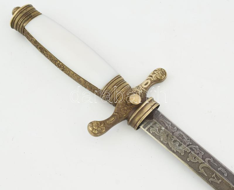 Beschreibung: Első Duna-Gőzhajózási Társaság (DSG / DDSG) hajóstiszti dísztőr REPLIKA, hüvellyel, h: 39,5 cm / Erste Donau-Dampfschiffahrts-Gesellschaft, "First Danube Steamboat Shipping Company" (DSG / DDSG) marine officer's dagger REPLICA, with scabbard