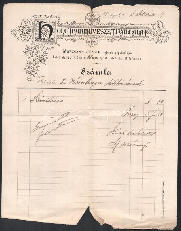 1886 Honi Iparművészeti Vállalat Morzsányi József tagja és képviselője... https://www.darabanth.com/de/477-Fernauktion/477.0/Kunst-Dokumente-andere-Sammelgebiete/Werbungen~2000002/1886-Honi-Iparmuveszeti-Vallalat-Morzsanyi-Jozsef-tagja-es-kepviseloje-szamla-Morzsanyi-J~II3251304