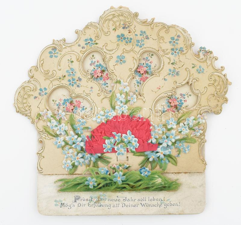 Beschreibung: 1896 "Prosit, das neue Jahr soll leben! Mög's Dir Erfüllung all Deiner Wünsche geben!", újévi térbeli üdvözlőlap, 12x12,5 cm