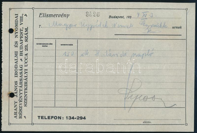 1939 Arany János Irodalmi és Nyomdai Részvénytársaság fejléces számla https://www.darabanth.com/de/477-Fernauktion/477.0/Kunst-Dokumente-andere-Sammelgebiete/Werbungen~2000002/1939-Arany-Janos-Irodalmi-es-Nyomdai-Reszvenytarsasag-fejleces-szamla~II3246950