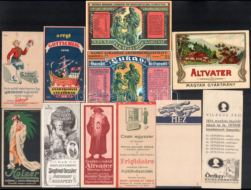 Beschreibung: 3 db régi magyar italcímke: Altvater likőr, Szent Lukácsfürdő gyógyvíz + 8 db számolócédula (közte Gottschlig, Holzer szőrme és divatáruház, stb.)