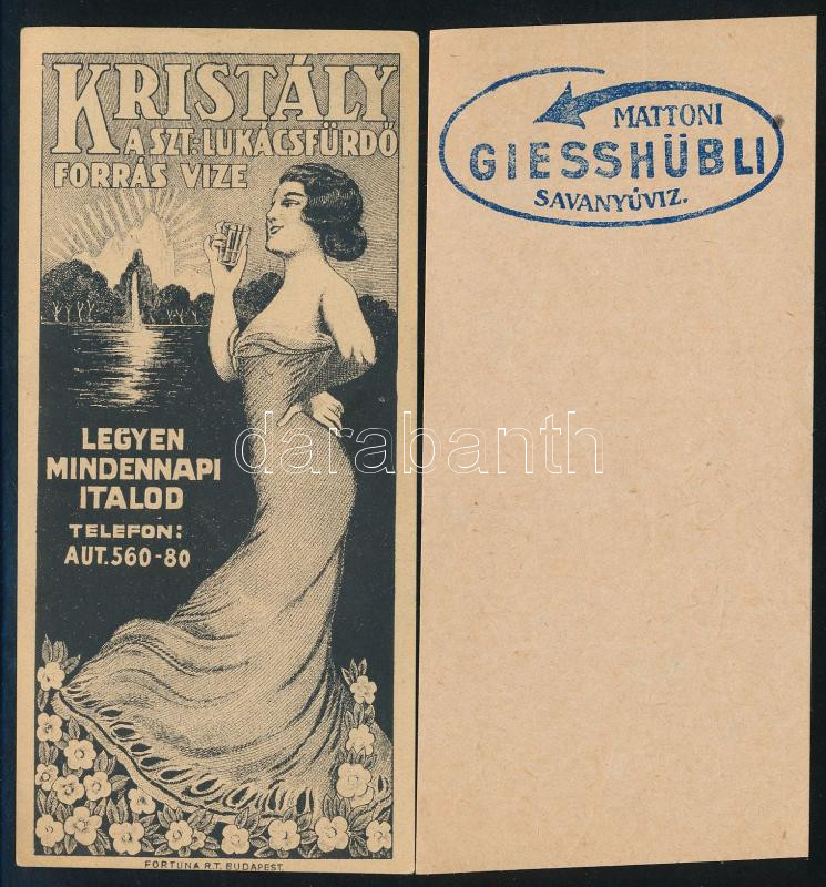 "Kristály, A Szt.-Lukácsfürdő Forrás vize" számolócédula. https://www.darabanth.com/de/477-Fernauktion/477.0/Kunst-Dokumente-andere-Sammelgebiete/Werbungen~2000002/Kristaly-A-Szt-Lukacsfurdo-Forras-vize-szamolocedula~II3192060