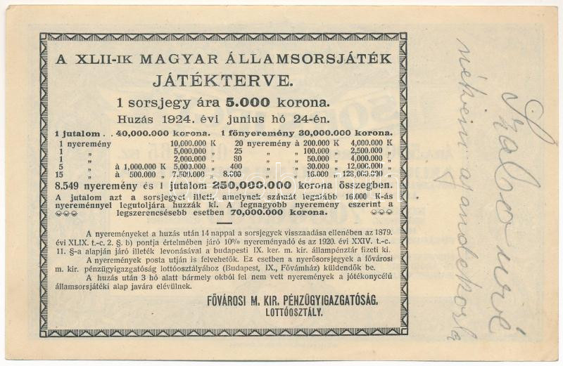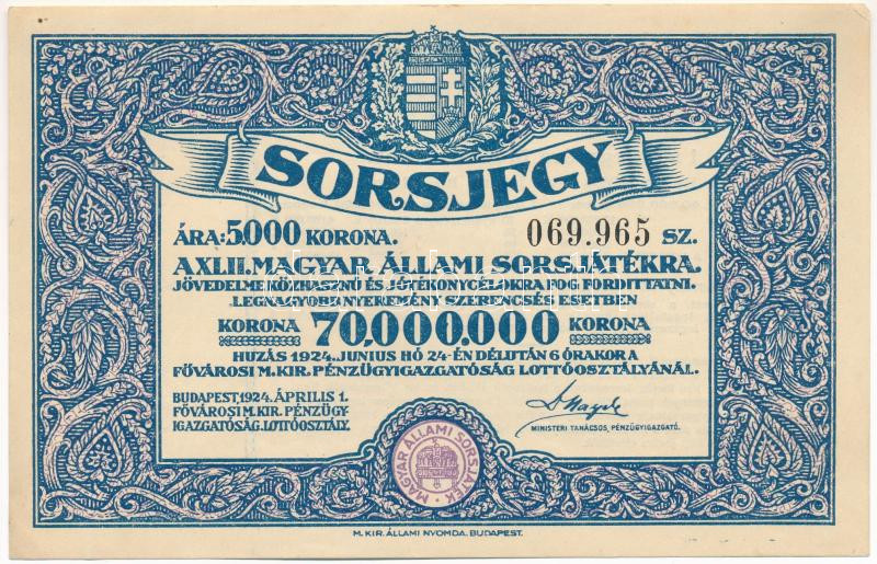 Beschreibung: Budapest 1924. "XLII. Magyar Állami Sorsjáték" sorsjegy 5000K értékben T:F szép papír