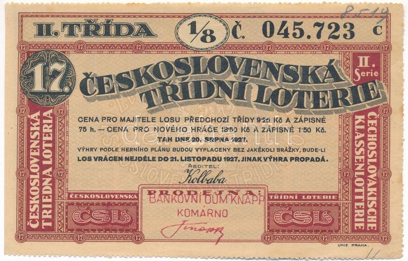Czechoslovakia 1927. "17. Ceskolovenská Trídní Loterie" 2nd class, 1/8 lottery ticket, with "BANKOVNI DUM KNAPP KOMÁRNO" cancellation C:AU,XF