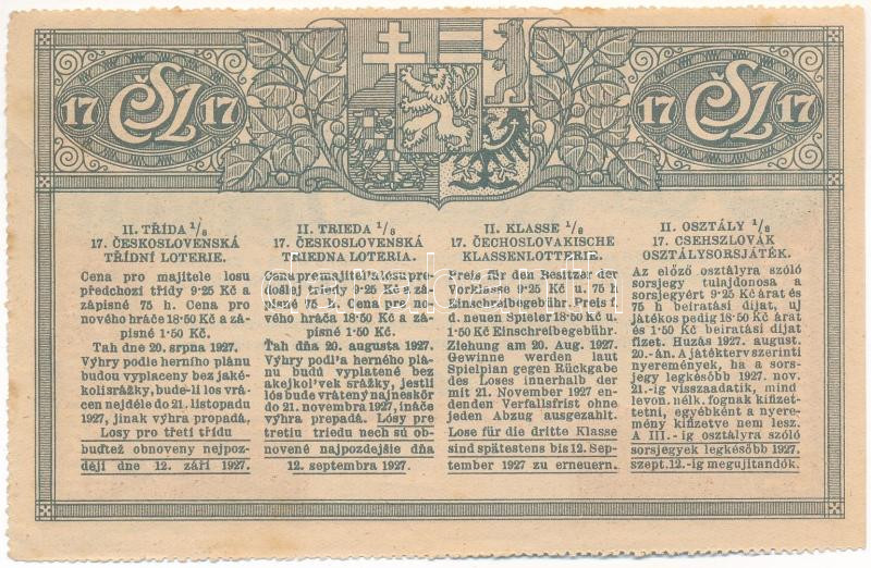 Csehszlovákia 1927. "17. Csehszlovák Osztálysorsjáték" másod... https://www.darabanth.com/de/477-Fernauktion/477.0/Numismatik/Aktien-und-Tickets~500007/Csehszlovakia-1927-17-Csehszlovak-Osztalysorsjatek-masodik-osztaly-18-ad-sorsjegye-BAN~II3206981