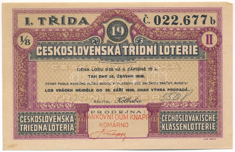 Czechoslovakia 1928. "19. Ceskolovenská Trídní Loterie" 1st class, 1/8 lottery ticket, with "BANKOVNI DUM KNAPP KOMÁRNO" cancellation C:AU,XF