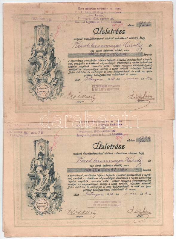 Esztergom 1916-1924. "Hangya - Esztergomi Fogyasztási és értékesí... https://www.darabanth.com/de/477-Fernauktion/477.0/Numismatik/Aktien-und-Tickets~500007/Esztergom-1916-1924-Hangya-Esztergomi-Fogyasztasi-es-ertekesito-Szovetkezet-uzletresze~II3244974