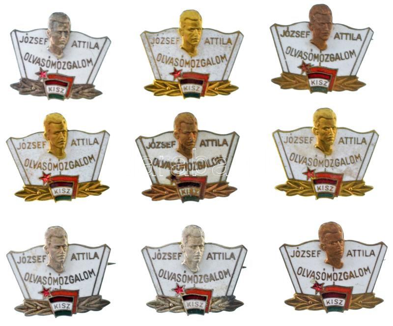 Beschreibung: ~1960-1970. "József Attila Olvasómozgalom - KISZ" zománcozott bronz jelvény (9db, 3xklf, benne aranyozott, ezüstözött és bronz) T:AU,XF