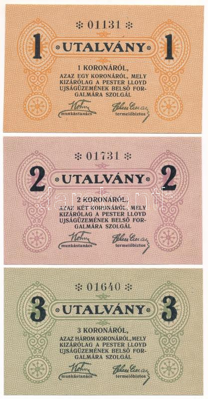 Budapest ~1920. 1K + 2K + 3K "Pester Lloyd" utalvány bélyegz... https://www.darabanth.com/de/477-Fernauktion/477.0/Numismatik/Notgeld-aus-Papier-und-Metall~500008/Budapest-7E1920-1K-plus-2K-plus-3K-Pester-Lloyd-utalvany-belyegzes-nelkul-TAU-az-egyiken-tores-n~II3226226
