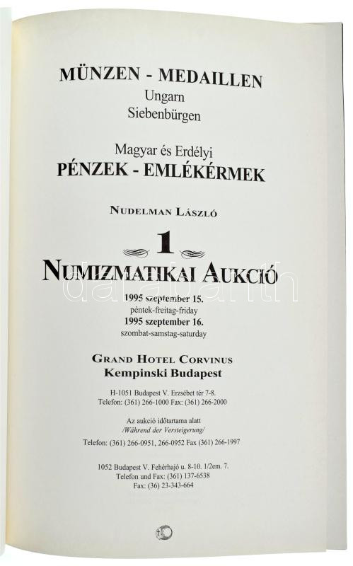 Nudelman László: Magyar és Erdélyi Pénzek-Emlékérmek - 1. Numizmatikai Aukció - 1995 szeptember 15-16. Grand Hotel Corvinus Kempinski Budapest. Elkelési árlistával. Jó állapotú kötet