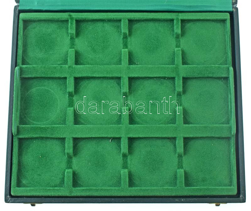 Beschreibung: "Magyar Érmeforgalmazó" zöld műbőr éremtartó kazettája 1 kivehető tálcával, összesen 24 férőhellyel (54x53mm/db), használt, kissé kopott állapotban
