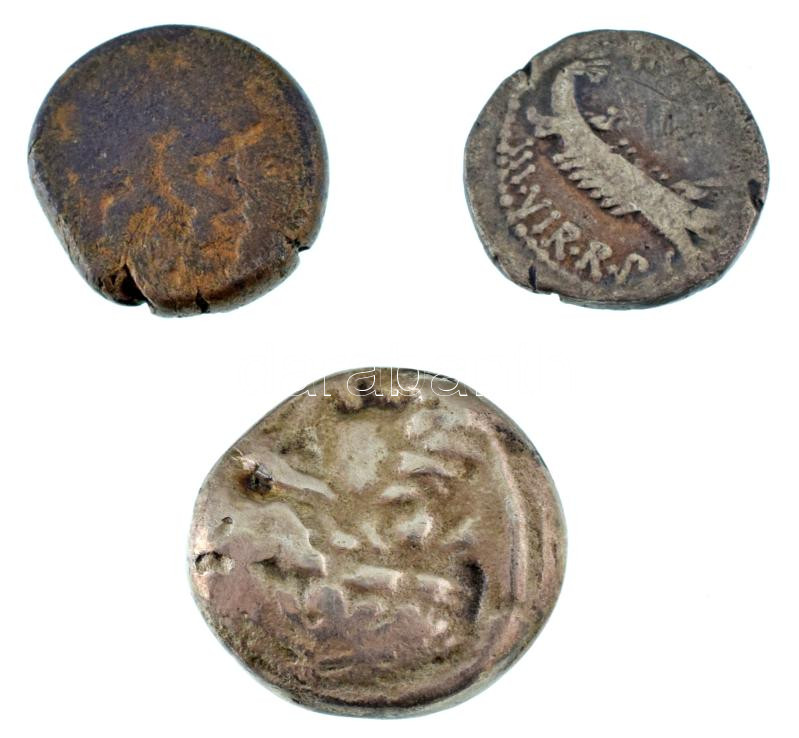 Vegyes, 3db-os ókori lot, közte Római Köztársaság / Marcus Antonius Kr.e. 32-31. Antoninianus Ag (3,37g) + Görög? ezüst érme (13,21g) + kopottabb bronz érme (5,99g) T:F Mixed, 3pcs ancient lot, in it Republic of Rome / Marcus Antonius 32-31 BC Legionary Denarius Ag "ANT AVG III VIR R P C / LEG IX" (3,37g) + Greek? silver coin (13,21g) + worned bronze coin (5,99g) C:F