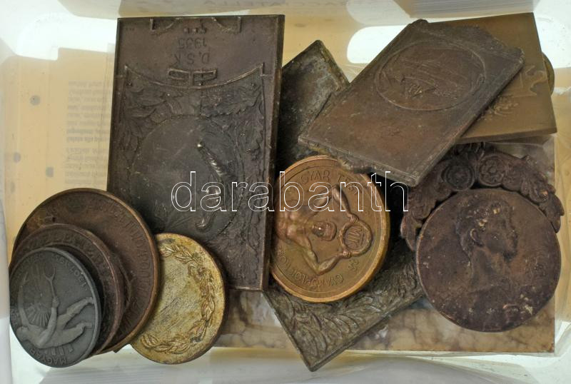 Beschreibung: 13db-os vegyes bronz sportérem tétel, közte 1947. "FTC Orsz. II. O. Ten. Bajn. - N.R. II." bronz emlékplakett (39x68mm) márványtalapzathoz (63x100x30mm) rögzítve, hátulján "Ludvig Éremverő" kopott matricával T:XF-F patina