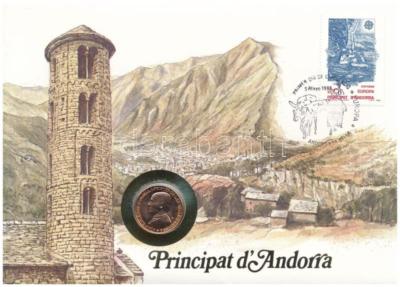 Andorra 1986. 25c felbélyegzett borítékban, bélyegzéssel, német nyelvű leírással T:UNC Andorra 1986. 25 Centims in envelope with stamp and cancellation, with german language description C:UNC
