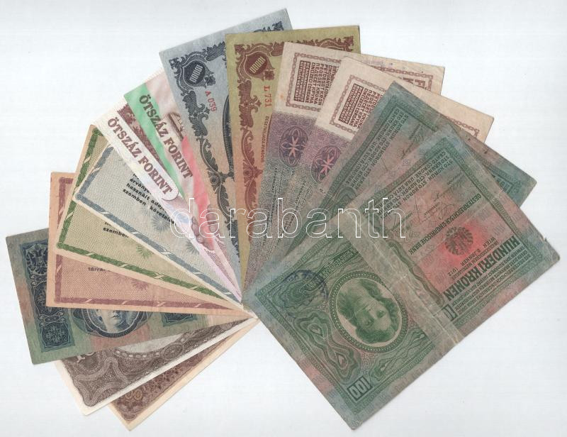 Beschreibung: 14db-os magyar bankjegytétel, közte 1915. 10K hamis "ŽUPANJISKA BALAST VUKOVAR" felülbélyegzéssel T:F-G közte szép papír