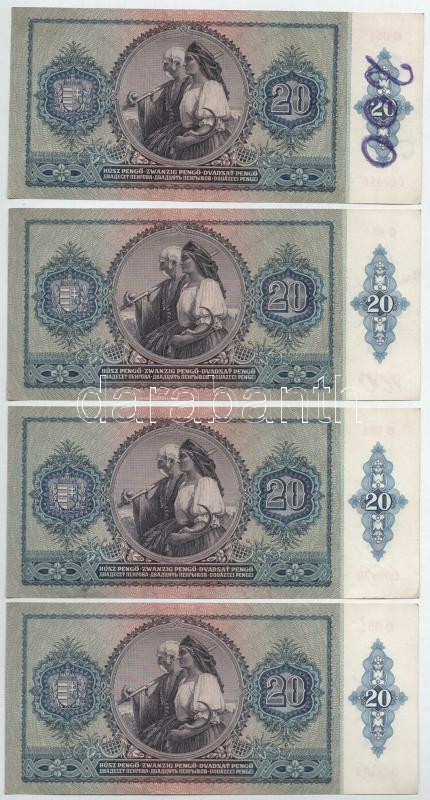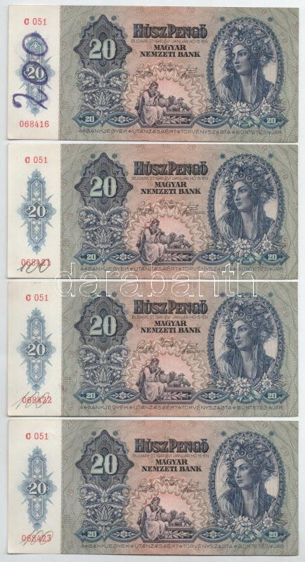 1941. 20P (4x), közeli sorszámmal és sorszámkövetők "C 051 068416... https://www.darabanth.com/de/477-Fernauktion/477.0/Numismatik/Ungarische-Banknoten~500009/1941-20P-4x-kozeli-sorszammal-es-sorszamkovetok-C-051-068416-068423-TAU-firka-Adamo-P~II3246606