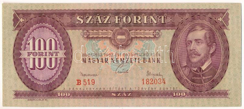 1962. 100Ft "B 519 182034" T:UNC Adamo F31 https://www.darabanth.com/de/477-Fernauktion/477.0/Numismatik/Ungarische-Banknoten~500009/1962-100Ft-B-519-182034-TUNC-Adamo-F31~II3253105