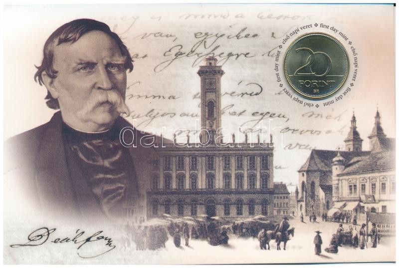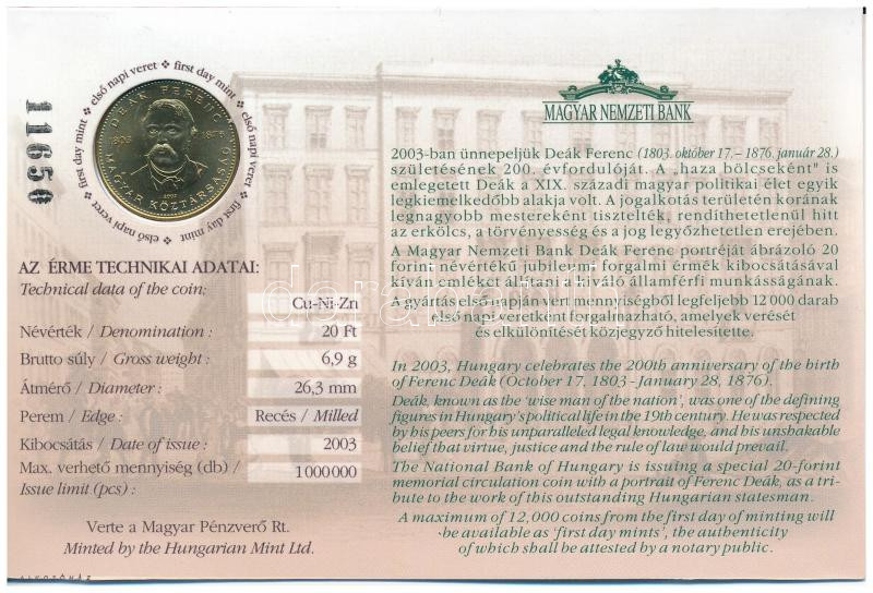 2003. 20Ft Cu-Ni-Zn "Deák Ferenc" elsőnapi veret "11650... https://www.darabanth.com/de/477-Fernauktion/477.0/Numismatik/Ungarische-Munzen-und-Munzen-mit-ungarischem-Munzzeichen~500010/2003-20Ft-Cu-Ni-Zn-Deak-Ferenc-elsonapi-veret-11650-sorszamu-emleklapon-TUNC-Adamo-FOEM2~II3245092