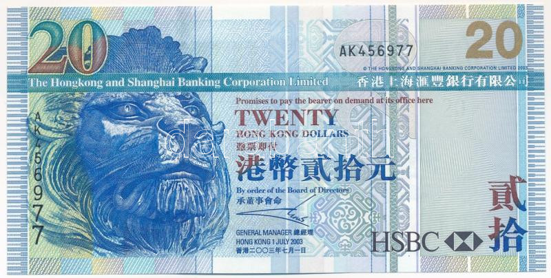 Hong Kong 2003. 20 Dollars "AK 456977" C:UNC