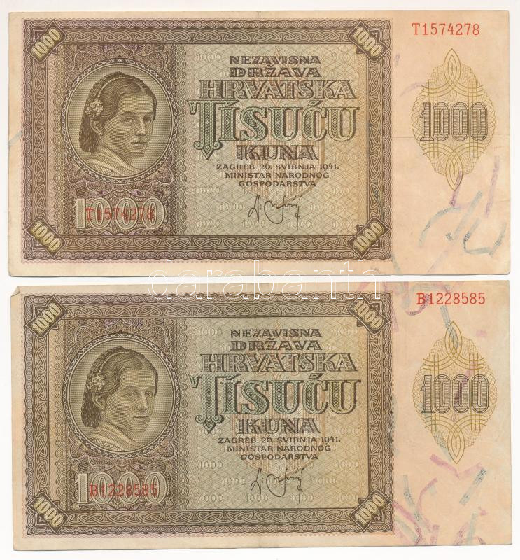 Horvátország / Független Horvát Állam 1941. 1000K "T + B" (2xklf) T:F szép papír