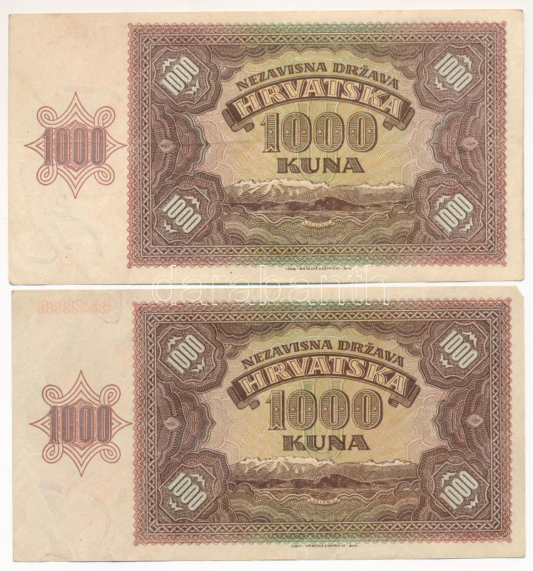 Independent State of Croatia 1941. 1000 Kuna "T + B" (2xdiff) C:F fine paper