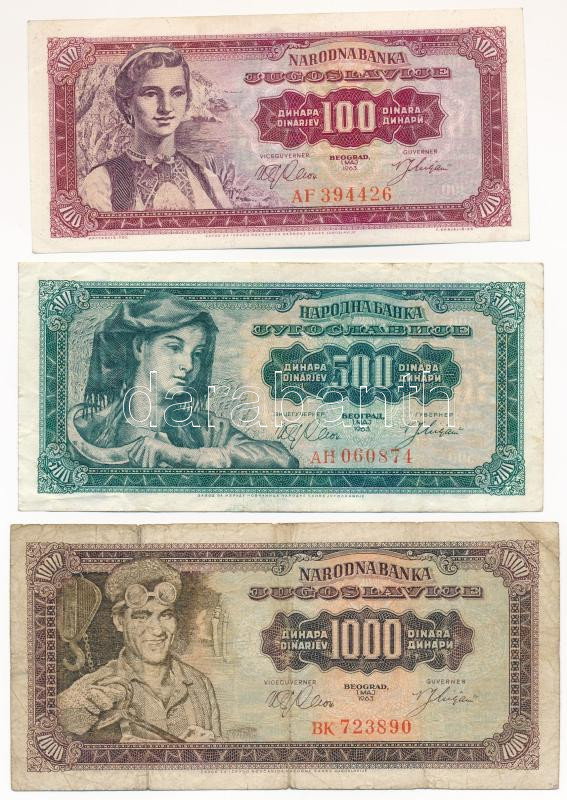 Yugoslavia 1963. 100 Di... https://www.darabanth.com/de/477-Fernauktion/477.0/Numismatik/Weltweit-Banknoten~500016/Jugoszlavia-1963-100D-plus-500D-plus-1000D-TXF-VG-Yugoslavia-1963-100-Dinara-plus-500-Dinara-plus-1000-Dina~II3250452