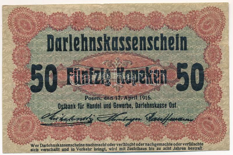 Litvánia / I. Világháború / Német megszállás / Darlehnskasse Ost, Posen 1916. 50k T:F