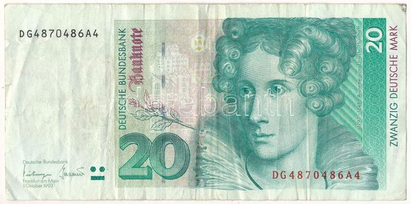FRG 1993. 20 Mark "D... https://www.darabanth.com/de/477-Fernauktion/477.0/Numismatik/Weltweit-Banknoten~500016/NSZK-1993-20M-DG4870486A4-TF--FRG-1993-20-Mark-DG4870486A4-CF--Krause-P2339b~II3250460