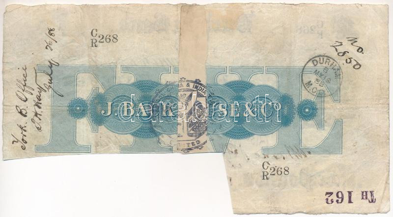 Nagy-Britannia / Durham Bank 1887. 5P "CR 268" hátoldalán bélyegzések, aláírások kivágva, így érvénytelenítve T:G folt, tűlyuk, sarokhiány, ragasztva Great Britain / Durham Bank 1887. 5 Pounds "CR 268" with overprints on the back, cut-out signatures, cancelled banknote C:G spot, needle holes, taped