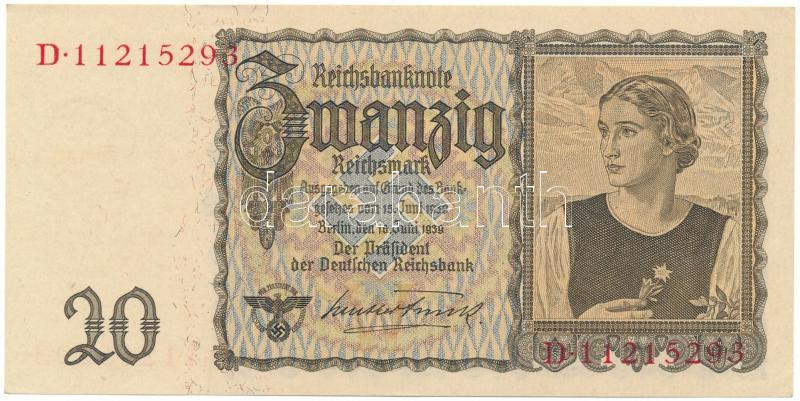 Német Harmadik Birodalom 1939. 20M T:AU German Third Reich 1939. 20 Re... https://www.darabanth.com/de/477-Fernauktion/477.0/Numismatik/Weltweit-Banknoten~500016/Nemet-Harmadik-Birodalom-1939-20M-TAU-German-Third-Reich-1939-20-Reichsmark-CAU-Krause-P23185~II3246515