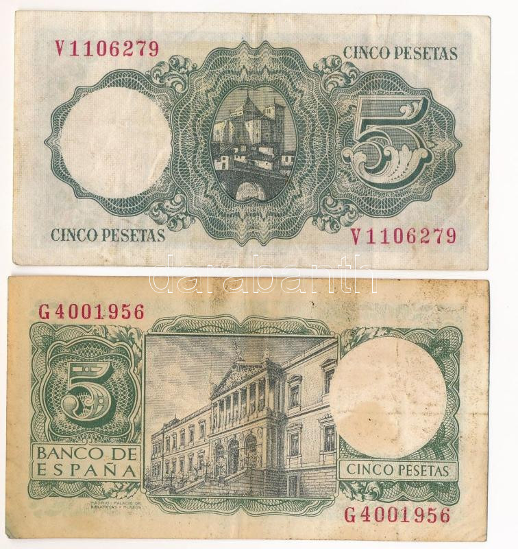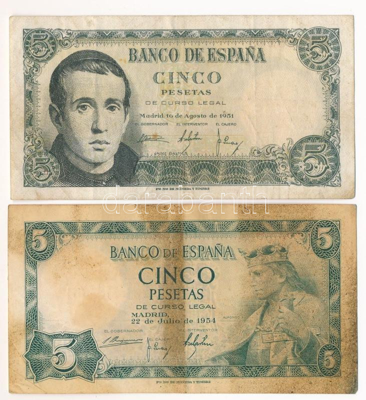 Spanyolország 1951. 5P + 1954. 5P T:F foltos Spain 1951. 5 Pesetas + 1... https://www.darabanth.com/de/477-Fernauktion/477.0/Numismatik/Weltweit-Banknoten~500016/Spanyolorszag-1951-5P-plus-1954-5P-TF-foltos-Spain-1951-5-Pesetas-plus-1954-5-Pesetas-CF-spotted~II3245331