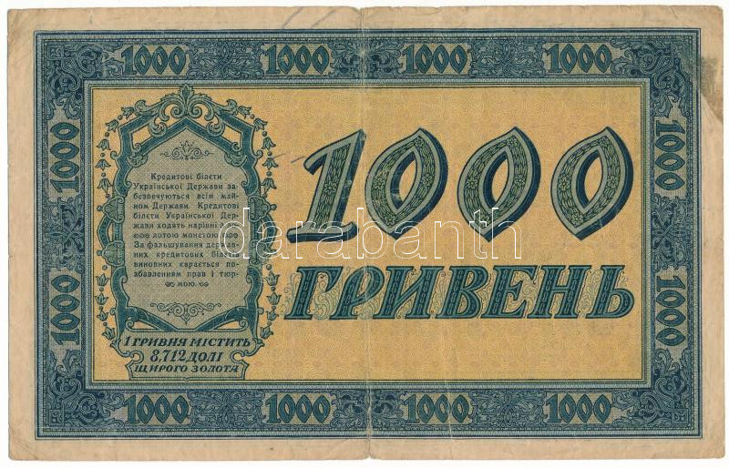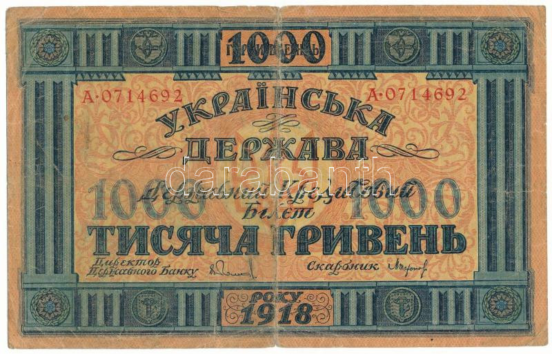 Ukrajna / Autonóm Köztársaság 1918. 1000H "A 0714692" T:F,VG... https://www.darabanth.com/de/477-Fernauktion/477.0/Numismatik/Weltweit-Banknoten~500016/Ukrajna-Autonom-Koztarsasag-1918-1000H-A-0714692-TF-VG-Ukraine-Autonomous-Republic-1918~II3246697