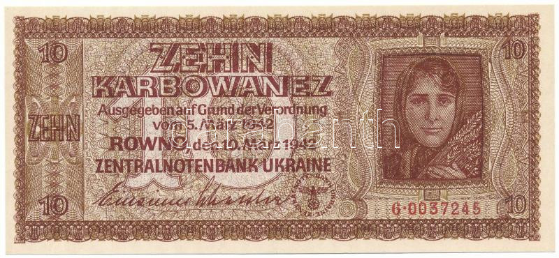 Beschreibung: Ukrajna / Német megszállás 1942. 10K "6 0037245" T:AU Ukraine / German occupation 1942. 10 Karbowanez "6 0037245" C:AU