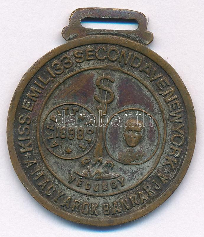 Amerikai Egyesült Államok 1916. "Isten áldd meg a magyart, jó kedvvel, bőséggel! - Az új közös címer / Kiss Emil, 133 Second Ave, New York - A magyarok bankárja" kétoldalas bronz védjegy (37x32mm) T:XF USA 1916. "Isten álld meg a magyart, jó kedvvel, bőséggel! - Az új közös címer / Kiss Emil, 133 Second Ave, New York - A magyarok bankárja (God bless the Hungarians with good cheer and abundance! - The new common coat of arms / Kiss Emil, 133 Second Ave, New York - Banker of the Hungarians)" double-sided bronze trademark medallion (37x32mm) C:XF