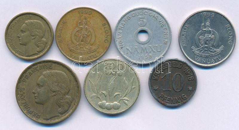 France 1951. 10 Francs Cu-Al + 50 Francs Cu-Al + Vanuatu 1990-2002. 5 Vatu alpakka + 10 Vatu Cu-Ni + 100 Vatu alpakka + Vietnám 1958. 5 Xu Al + Német Birodalom / Koblenz 1918. 10 Pfenning Fe C:XF-VF