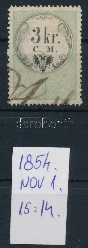 Beschreibung: 1854 3kr okmánybélyeg 15:14-es ritka fogazatváltozattal