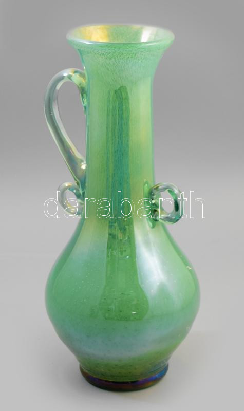 Beschreibung: Cseh zölden irizáló iparművész hutaüveg váza, kis kopással, m: 33 cm