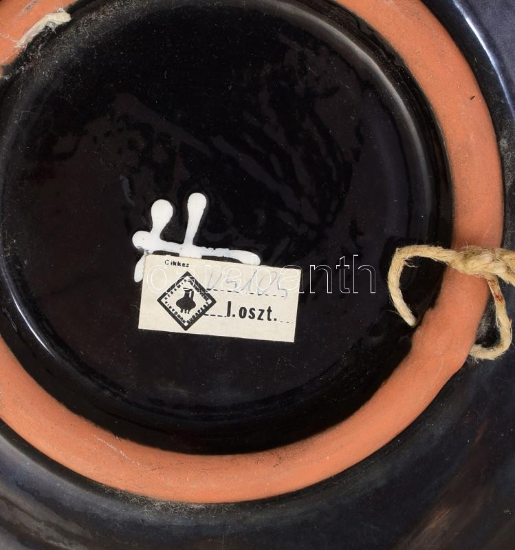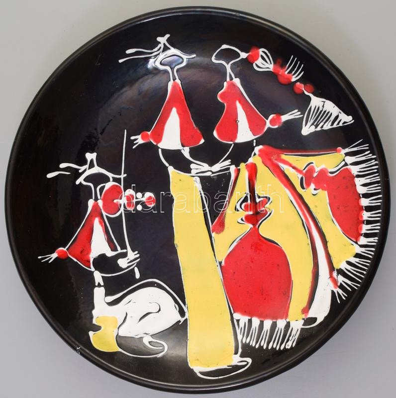 Beschreibung: Holló Katalin által készített dísztányér álomszerű jelenettel díszítve, jelzett, kopott, d: 29 cm