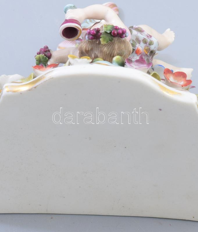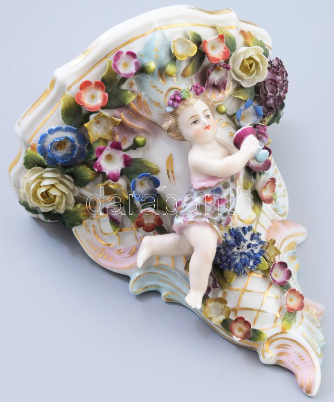 Beschreibung: cca 1880-1920 Sitzendorf borozó puttó figurával és plasztikus virágokkal gazdagon díszített falikonzol. Jelzett, szirmokon 1-1 hiánnyal, 13,5x12,5 cm