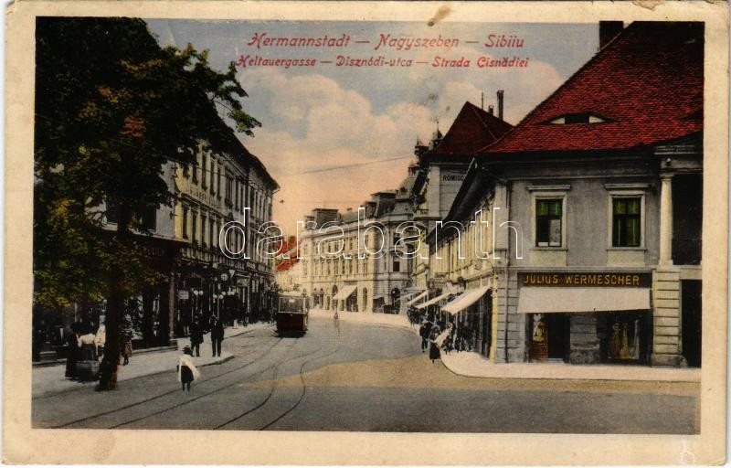 1916 Nagyszeben, Hermannstadt, Sibiu; Disznódi utca, villamos, Julius Wermescher üzlete, Transsylvania szálloda. Kiadja Jos. Drotleff Nr. 502. / Strada Cisnadei / Heltauergasse / street, shops, tram, hotel (EM)