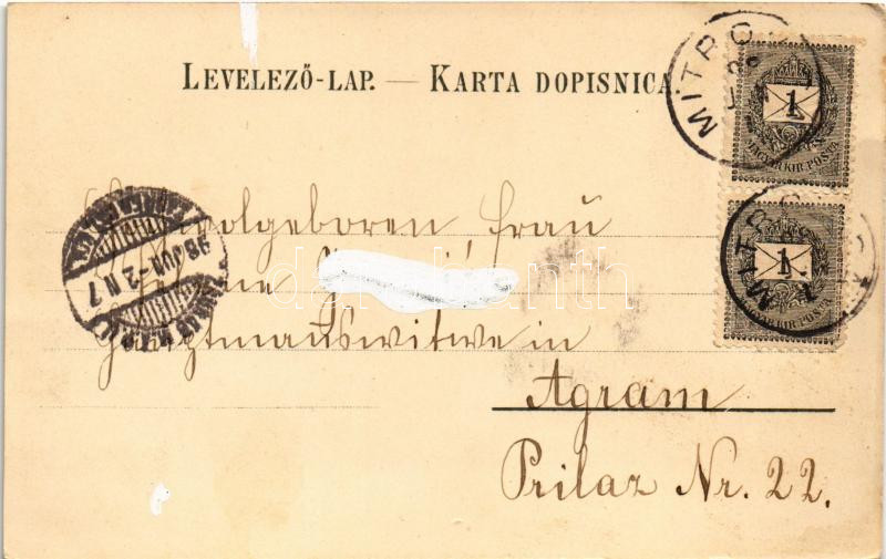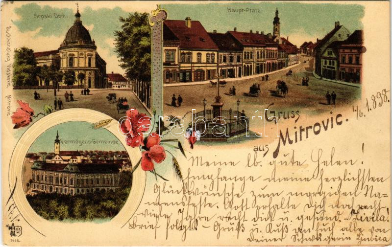 1898 (Vorläufer) Szávaszentdemeter, Mitrovice, Mitrovitz an der Save, Sremska Mitrovica; Srpski dom, Haupt-Platz, Vermögens-Gemeinde / Szerb nemzeti ház, Fő tér. Vidakovic kiadása / Serbian National House, main square. O.Z.M. Art Nouveau, floral, litho (EK)