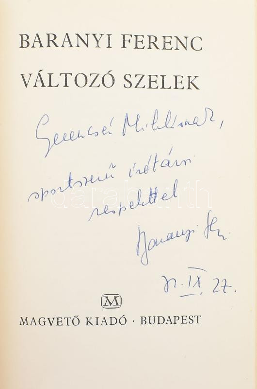 Baranyi Ferenc: Változó szelek. A szerző, Baranyi Ferenc (1937-) Kossuth- és József Attila-díjas költő, író által Kolek Vera újságíró, a rádió riportere részére DEDIKÁLT példány! Bp.,1972,Magvető. Kiadói egészvászon-kötés.