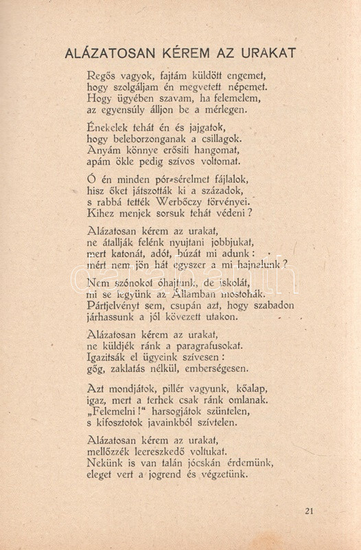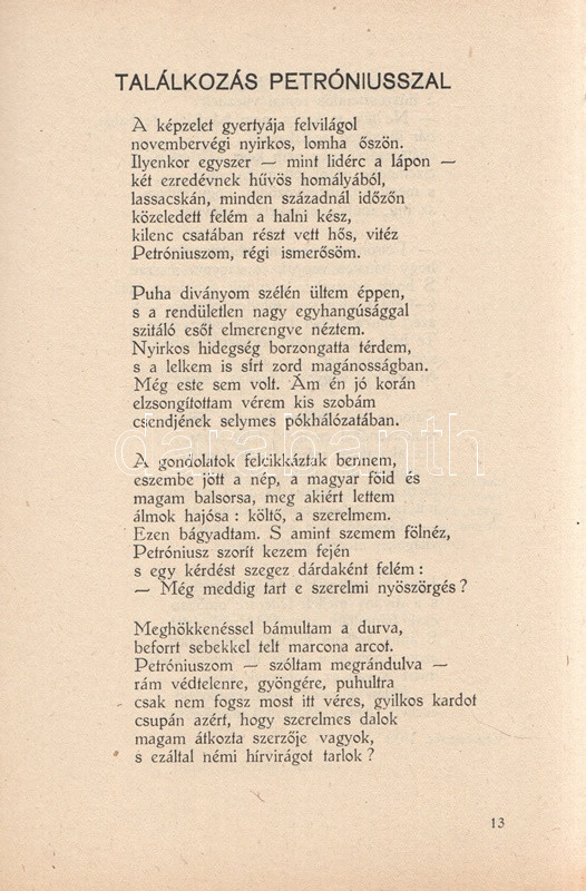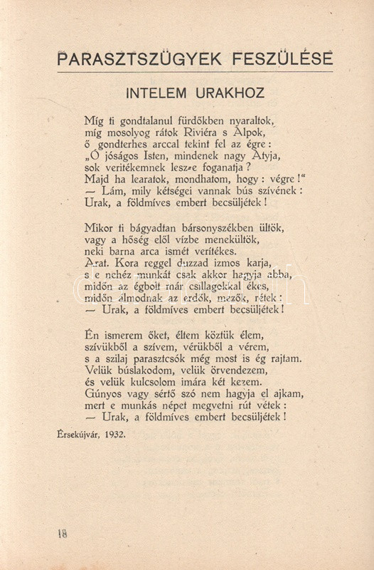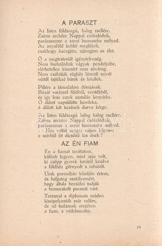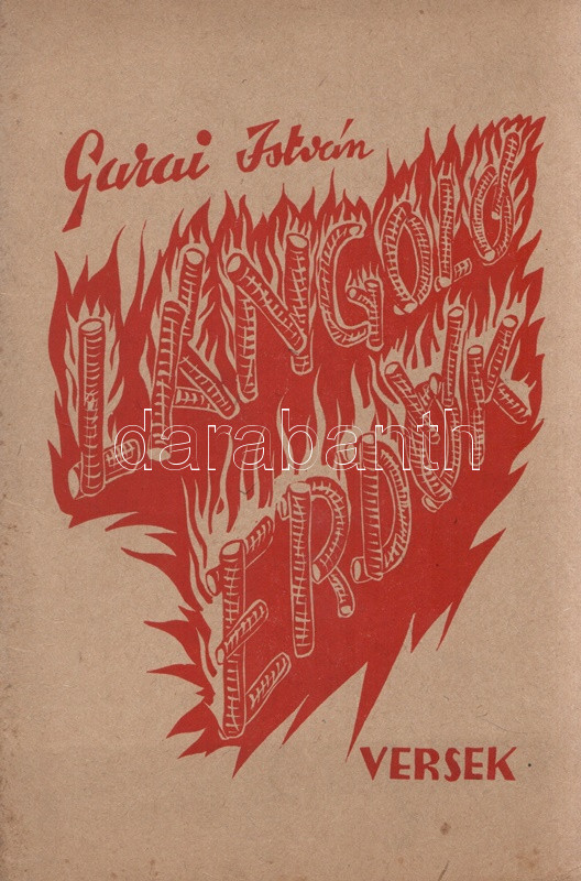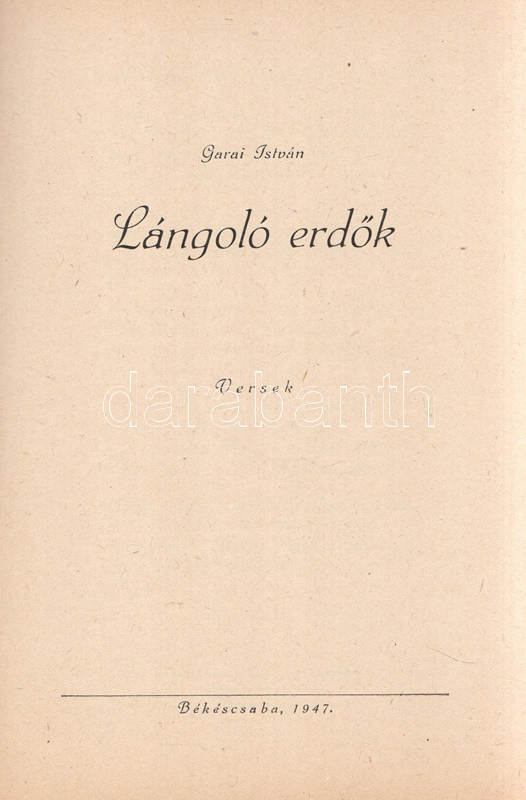 Garai István: Lángoló erdők. Versek. Békéscsaba, 1947. (A szerző kiadása - Gesmey-nyomda). 66 + [2] p. Egyetlen kiadás. Garai István (1915-2008) költő, pedagógus. A felvidéki származású pedagógus az országbővítés éveiben Dunaszerdahelyen, Ipolyságon, majd a Bácskában tanított latint, Bács-Petrőcön jelent meg négy verseskötete. A második világháború után Békéscsabán tanított, itt is sorban jelentek meg kötetei, egészen 1948. évi Mesekirály című kötetéig, amelyet betiltottak, szerzőjét beperelték és bebörtönözték, a szerző pedig egészen az 1970-es évekig nem publikálhatott, mivel néhány verse erősen felemelte a hangját az utódállamok magyarellenes etnikai tisztogatásai és a csehszlovák állam felvidéki magyarokat illető kollektív jogfosztása ellen, illetve általánosságban is tematizálta a határon túl rekedt magyarság sorsát. ,,Lángoló erdők" című kötete viszont még biztonságos témákkal jelentkezik, szerelmi lírával, a parasztsors témáival, illetve a két háború között írt, társadalmi kérdéseket feszegető szövegekkel. A kötetet Lengyel Lóránt és Sáros András grafikái díszítik. Fűzve, illusztrált kiadói borítóban. Jó példány.