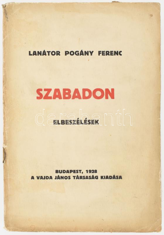Lanátor Pogány Ferenc: Szabadon. Elbeszélések. Bp., 1928, Vajda János Társaság (Phöbus-ny.), 170+(2) p. Első kiadás. Kiadói papírkötés, kissé foltos, sérült borítóval, helyenként kissé sérült lapszélekkel, katonai témájú ex libris-szel.