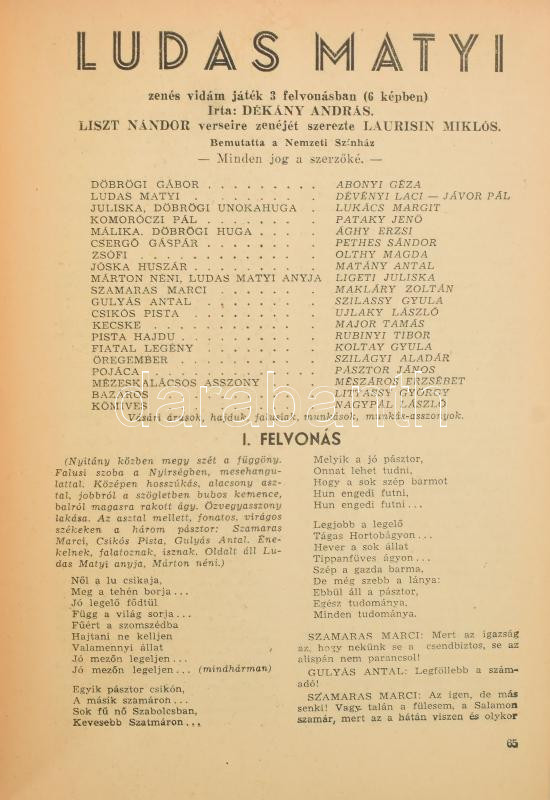 Ludas Matyi zenés vidám játék 3 felvonásban (6 képben) írta Dékány András Liszt NÁndor verseire zenéjét szerezte Laursin Miklós. Bemutatta a Nemzeti Színház. Mindhárom szerző által DEDIKÁLT példány 32p. Amatőr félvászon kötésben