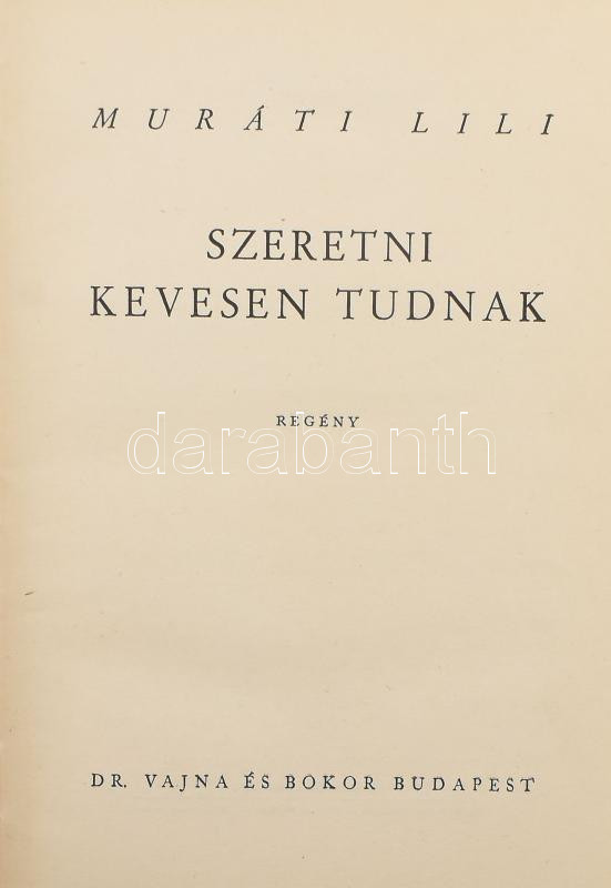 Muráti Lili: Szeretni kevesen tudnak. Bp., Dr. Vajna és Bokor. Kiadói ... https://www.darabanth.com/de/478-Fernauktion/478.0/Bucher/Bucher-Andere-kuriositaten~298/Murati-Lili-Szeretni-kevesen-tudnak-Bp-Dr-Vajna-es-Bokor-Kiadoi-egeszvaszon-kotes-kisse~II3262812