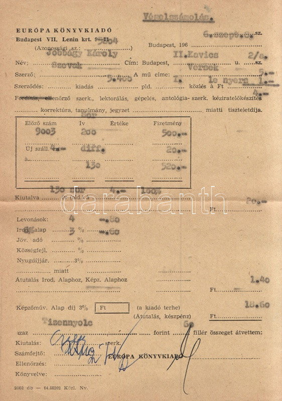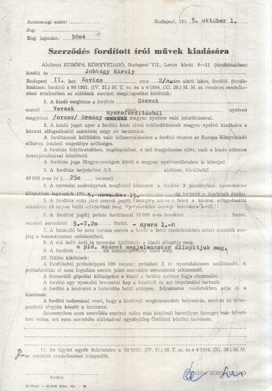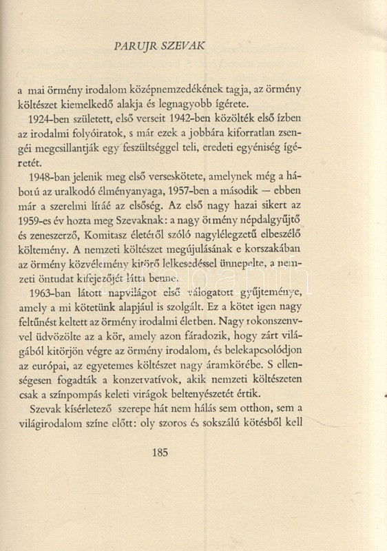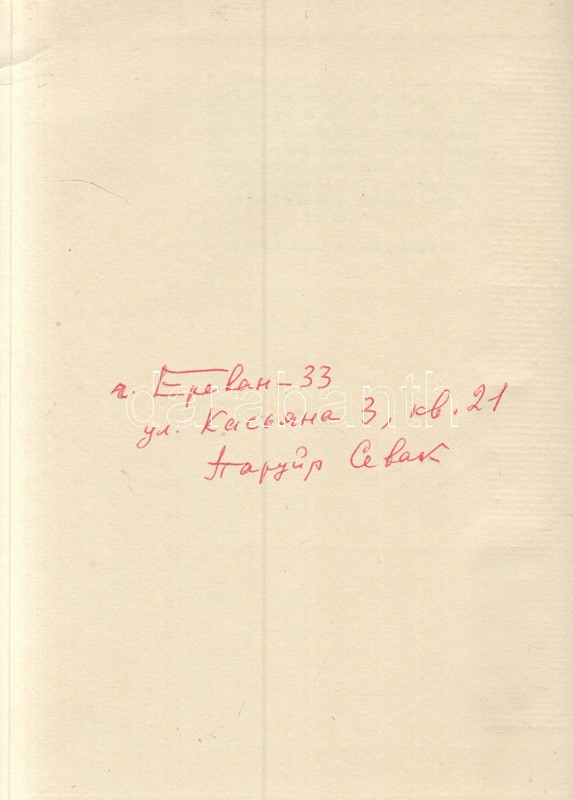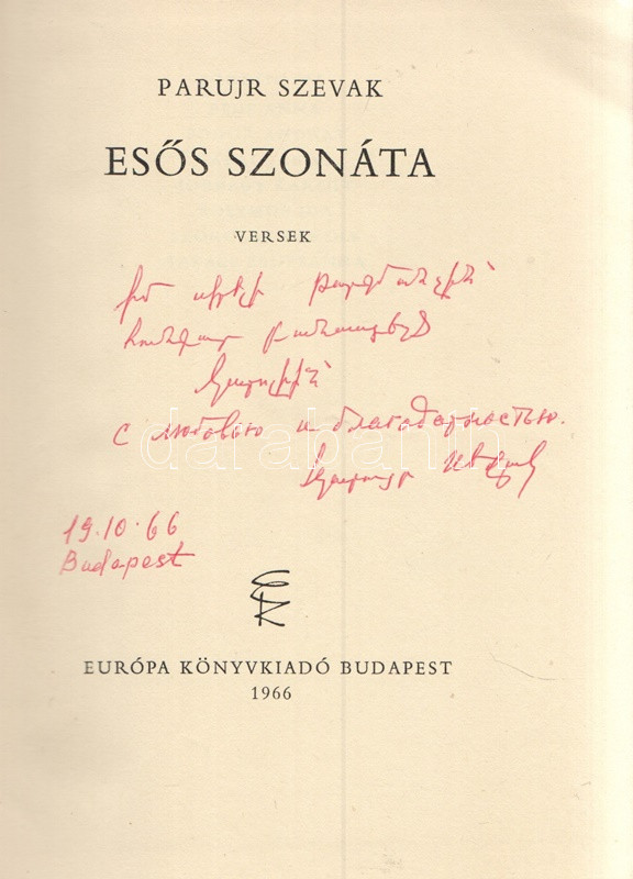 Szevak, Parujr: Esős szonáta. Versek. (Dedikált.) - A fordításkötet fordító szerződéseinek dokumentumai. Budapest, 1966. Európa Könyvkiadó (Alföldi Nyomda, Debrecen). 190 + [2] p. Egyetlen magyar kiadás. Válogatás Parurj Szevak (1924-1971) örmény költő verseiből, a szerző 1963. évi versgyűjteményei alapján. A címlapon az örmény költő saját kezű, orosz nyelvű dedikálása (Budapest, 1966, október 19.). A hátsó előzéken a szerző saját kezű aláírása, valamint jereváni lakcímének feltüntetése. Oldalszámozáson belül Bartha László egész oldalas grafikáival. A kötethez mellékelve két egyleveles műfordítói szerződés, Jobbágy Károly műfordító részére kiállítva, az Európa Kiadó igazgatója, Domokos János aláírásával hitelesítve. Poss.: Jobbágy Károly. [Jobbágy Károly (1921-1998) költő, orosz műfordító, gimnáziumi tanár és könyvtáros.] Illusztrált kiadói egészvászon kötésben, színes, illusztrált kiadói védőborítóban. Jó példány.