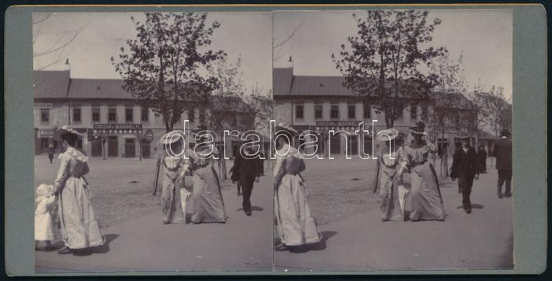 Beschreibung: 1904 Dés (Dej), főtéri részlet, Csiszár és Vásárhelyi üzlete, keményhátú sztereófotó, 9x18 cm