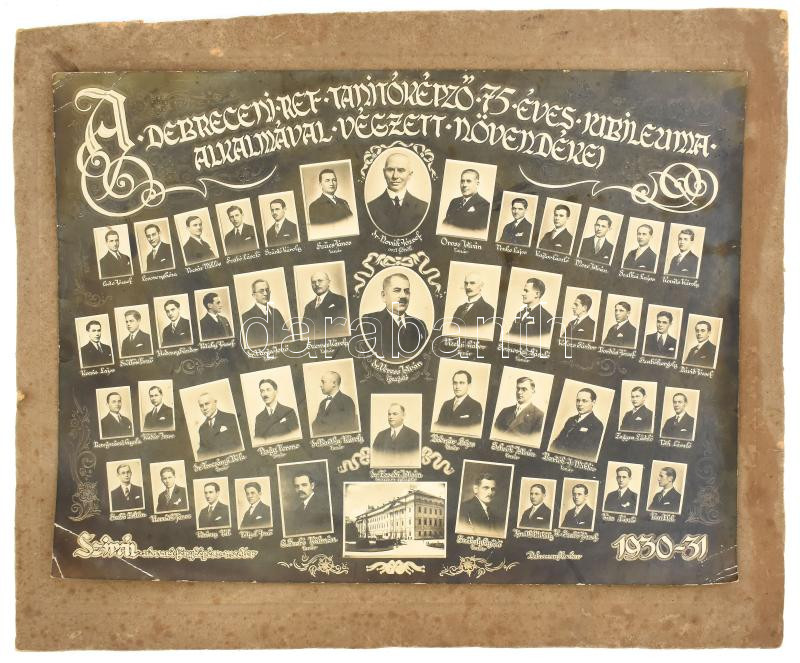 1930-31 A debreceni tanítóképző 75 éves jubileuma alkalmából végzett növendékei, tablófotó kartonra ragasztva, tanárok közt Gáborjáni Szabó Kálmán (1897?1955) és Ecsedi István (1885-1936) etnográfus, a Déri Múzeum alapító igazgatója, sarkában gyűrődésekkel, törésekkel. 28x38 cm