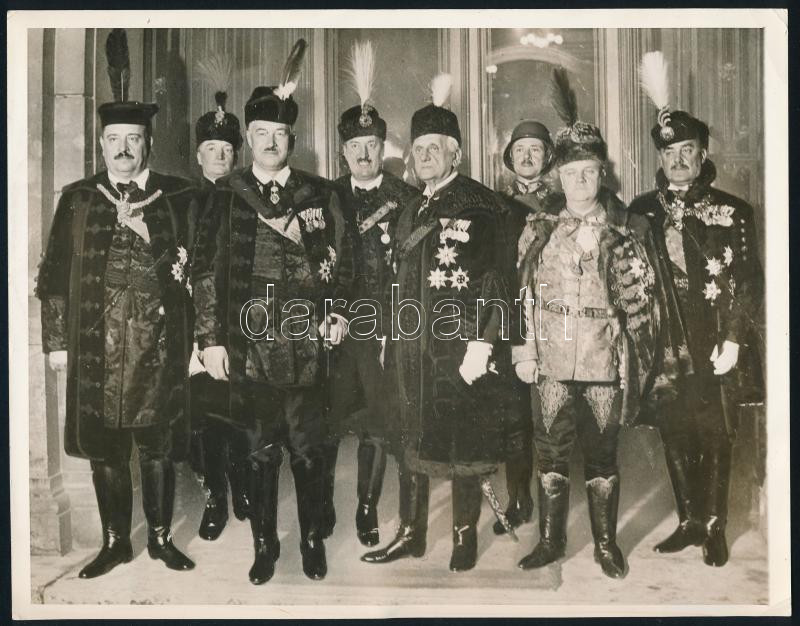 1936 A Darányi-kormány tagjai eskütételüket követően, balról jobbra: Hóman Bálint vallás- és közoktatásügyi miniszter, Bornemisza Géza kereskedelem- és közlekedésügyi miniszter, Lázár Andor igazságügy-miniszter, Kánya Kálmán külügyminiszter, Rőder Vilmos honvédelmi miniszter, Fabinyi Tihamér pénzügyminiszter, Kozma Miklós belügyminiszter. Amerikai sajtófotó (Associated Press Photo, New York), a hátoldalon angol nyelven feliratozva, 23x18 cm
